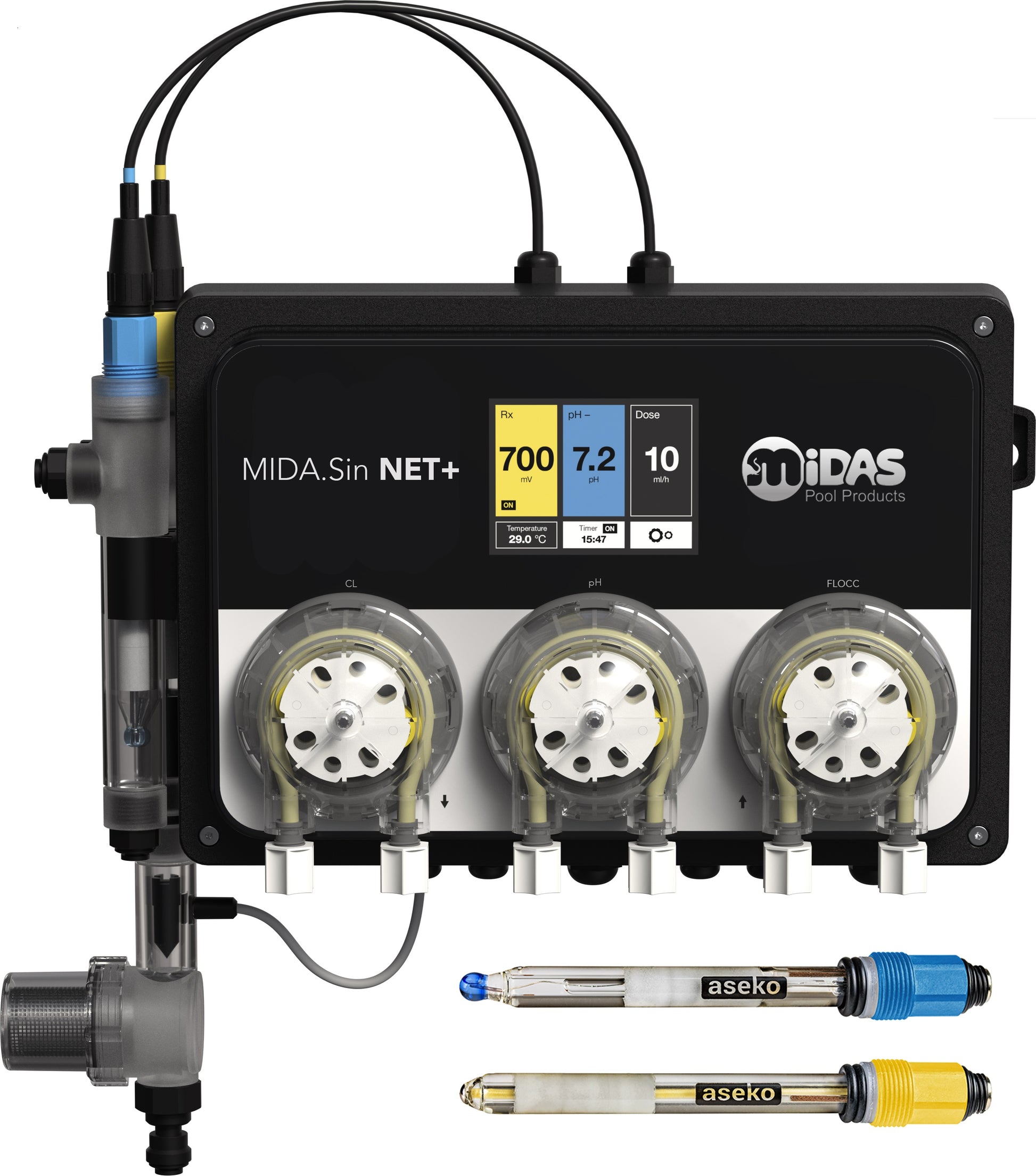 Ein echtes Premium Feature: Die Mida Sin Net + kann Elektrolyse parallel mit Flüssigchlor Dosierung kombinieren.