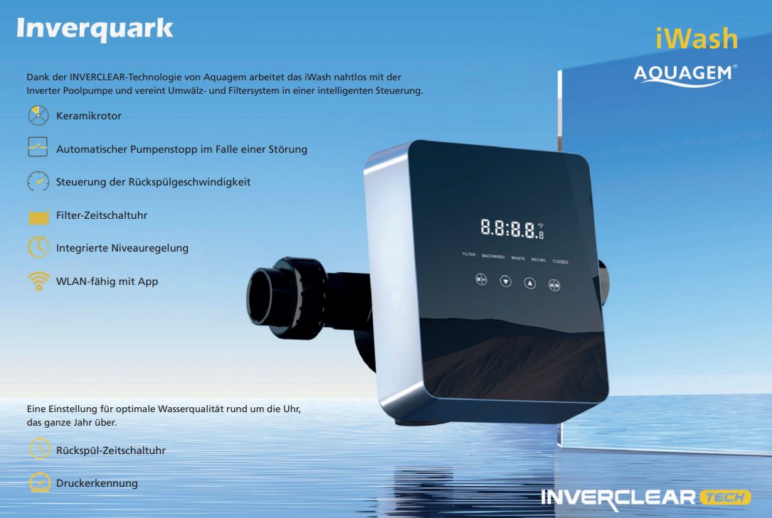 Dank der von Aquagem entwickelten Inverclear-Technologie arbeitet das iWash nahtlos mit Ihrer Inverter-Poolpumpe zusammen und vereint das Umwälz- und Filtersystem in einer intelligenten Steuerung. Genieße unbeschwertes Schwimmen mit modernster Technik und maximaler Energieeffizienz.